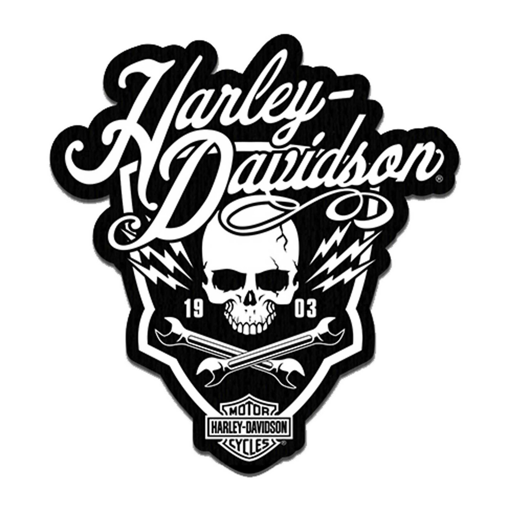+- Embroidered wrenches and skull graphic paired with H-D script