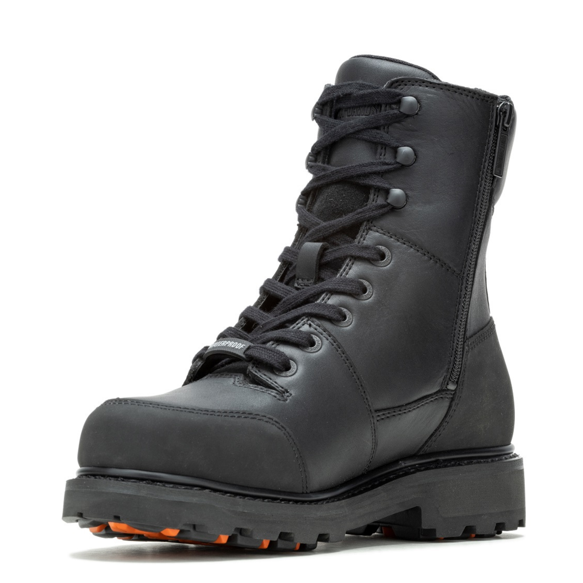 The Brockman waterproof full-grain leather riding boot is built for the serious biker. The full-length lining has a breathable Hydro-Guard™ waterproof membrane. The blacked-out hardware provides a rebellious look with an inside zipper for a quick and secure fit. With a ShockAbsorbers comfort rubber outsole, Poron® ankle protection for extra confidence while on the road, and TecTuff® abrasion resistant overlays, you'll only regret the rides you didn't take. The toe is rounded. A waterproof badge adorns the bottom lace for quick identification. The logo eyelets are blacked out, as well as the metal Bar & Shield® badge on the shaft. The tongue and rear cuff are padded. Add in the YKK® locking inside zipper, you’re out the door in no time. The street-side outsole is rated “BEST” in slip resistance, and it features Harley® orange tread elements for a sure grip and a nice and easy stride. A Harley-Davidson® orange logo is inserted on the instep, as well. The boot's rubber sole, insole and upper are bound using resoleable Goodyear® Welt construction processes, the most labor intensive and durable construction method available. For day-in and day-out wear in all weather conditions, these boots are an outstanding choice.
