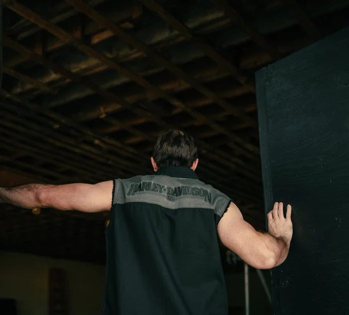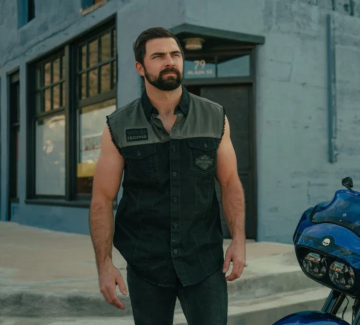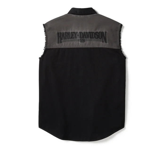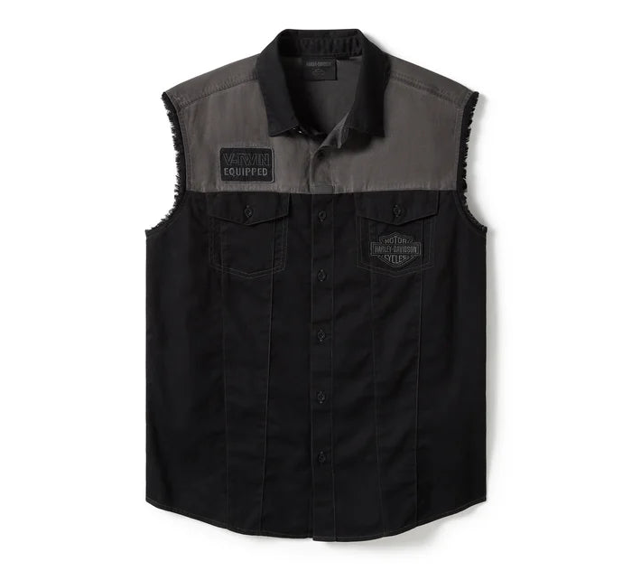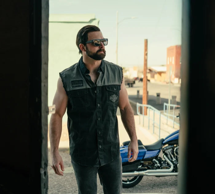 +H-D style takes a nostalgic detour on the limited-issue Iron Bond II Blowout. Crafted from a rugged yet breathable cut of cotton twill, this men’s sleeveless button down shirt features a hidden snap-down collar that won’t flap around under riding gear. Finished with classic H-D patches on front and graphics on back that mimic our 1980s tank art. Order now while supplies last.