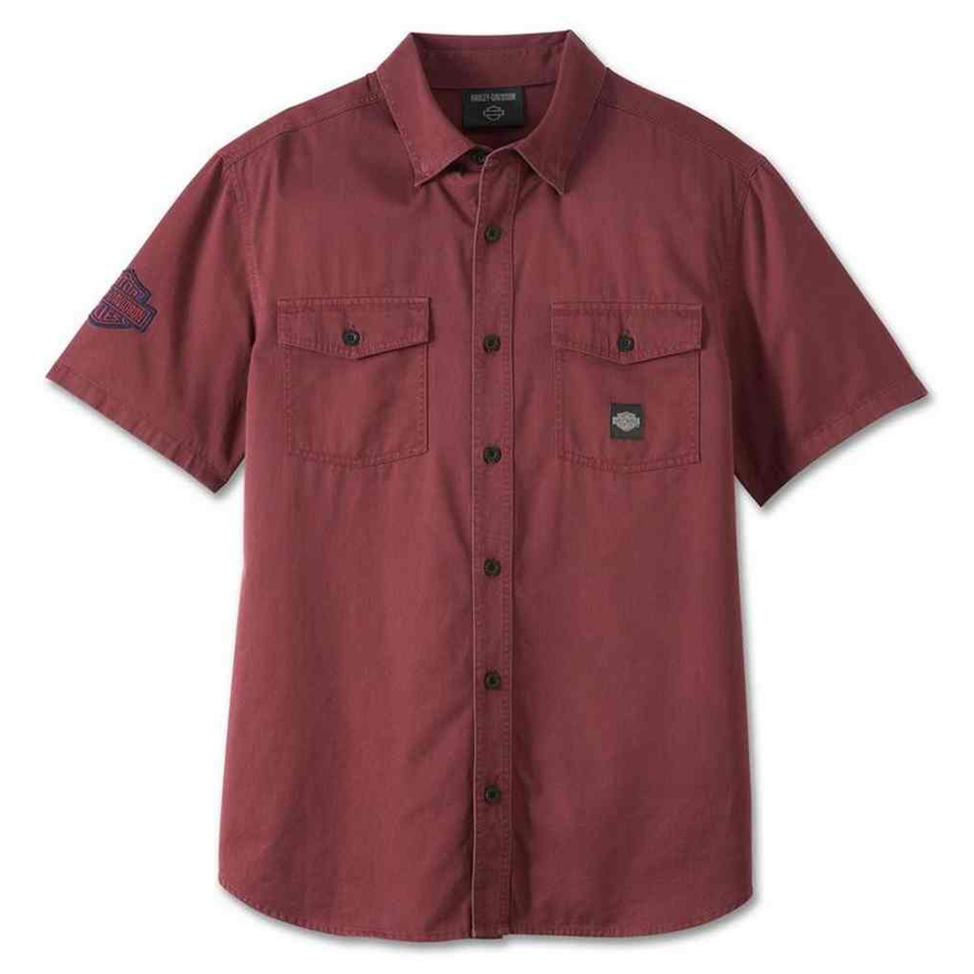 +You’ll clean up nice and keep it classic in our Whiplash Shirt. That’s because this short sleeve men’s shirt celebrates our earliest branding on the back yoke plus our legendary Bar & Shield on the sleeve, both in a pop of color. Made from durable cotton twill that’s enzyme stone washed for softness, it features hidden snaps so your collar won’t flap around while you ride. It’s a tried-and-true Harley look that’s ideal for workdays, date nights, or rallies.