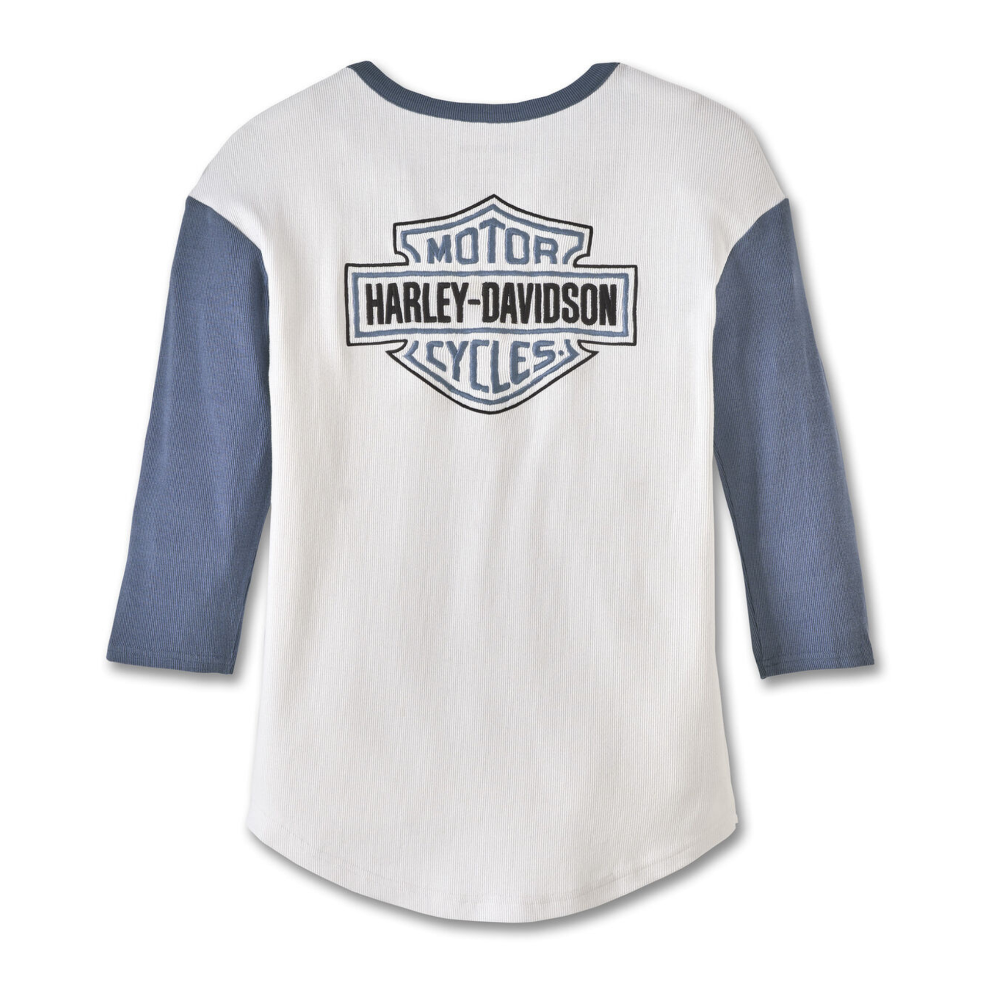 +Sport your love of casual comfort and Harley-Davidson in our Pride Contrast Henley. Made from breathable cotton with a hit of spandex rib for added stretch and texture (zoom in to check it out). This women?s top takes a stylish detour from your typical Henley with features like contrasting 3/4 sleeves, a sweetheart neckline, and a flattering shirttail hem that lengthens your leg line. Finished with our embroidered namesake perched on front and our beloved Bar & Shield big on the back.